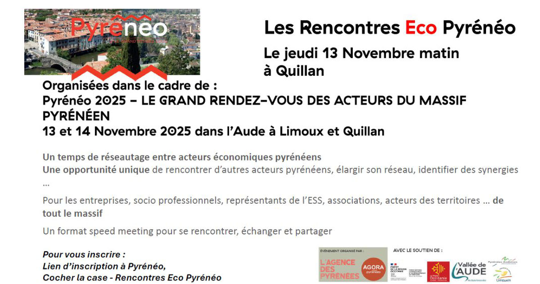 Les Rencontres des acteurs du Massif Pyrénéen ont lieu cette année en Haute-Vallée, à Quillan et Limoux, les 13 et 14 novembre prochain. Moments d'échange, temps de réseautage, rencontres, visites et ateliers sont au programme de ces journées Pyrénéo.